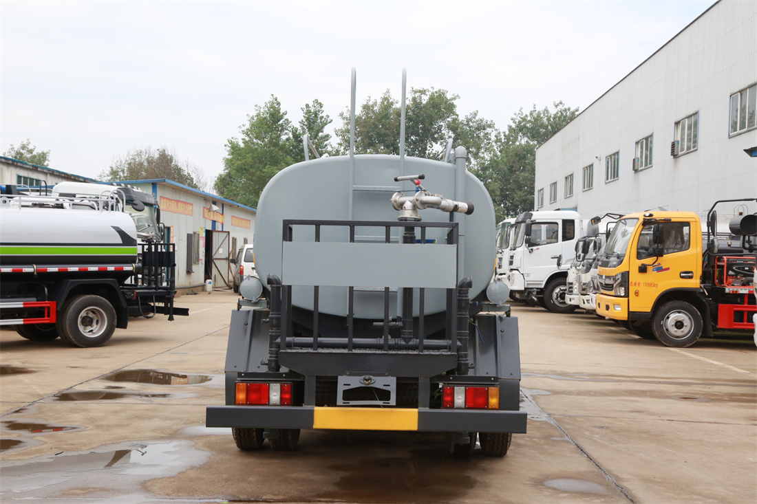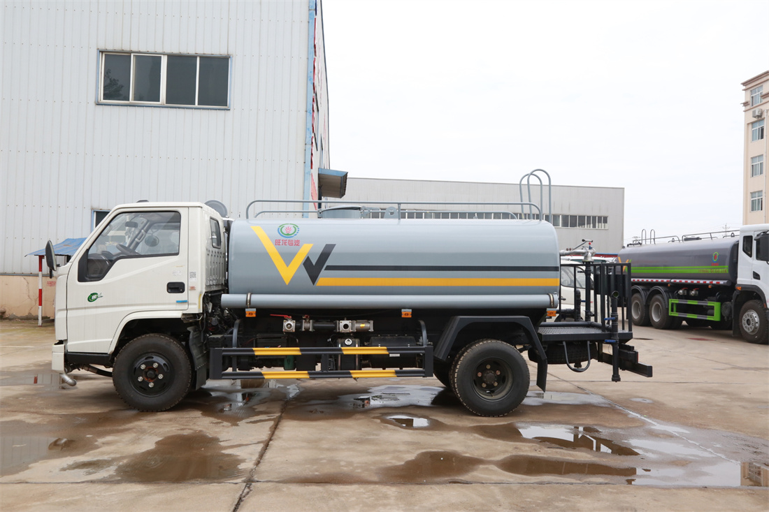灑水車前裝有鴨形噴嘴或圓頭沖嘴,后面裝有圓柱開灑水噴嘴或蓮蓬頭噴嘴,后部有一工作平臺,裝配有水炮。后部還可裝8個噴嘴(選裝)。