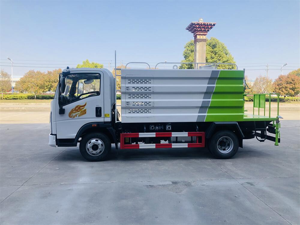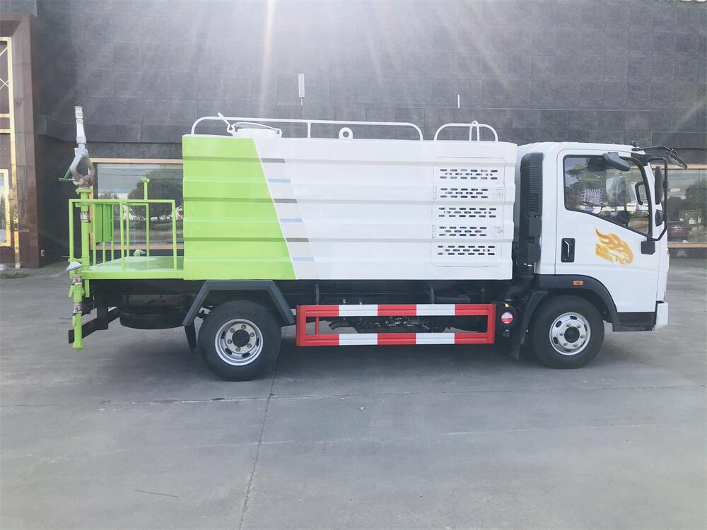 灑水車前裝有鴨形噴嘴或圓頭沖嘴,后面裝有圓柱開灑水噴嘴或蓮蓬頭噴嘴,后部有一工作平臺,裝配有水炮。后部還可裝8個噴嘴(選裝)。