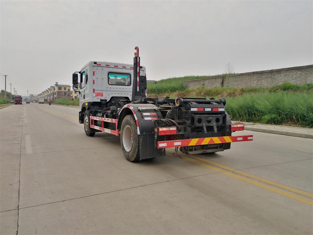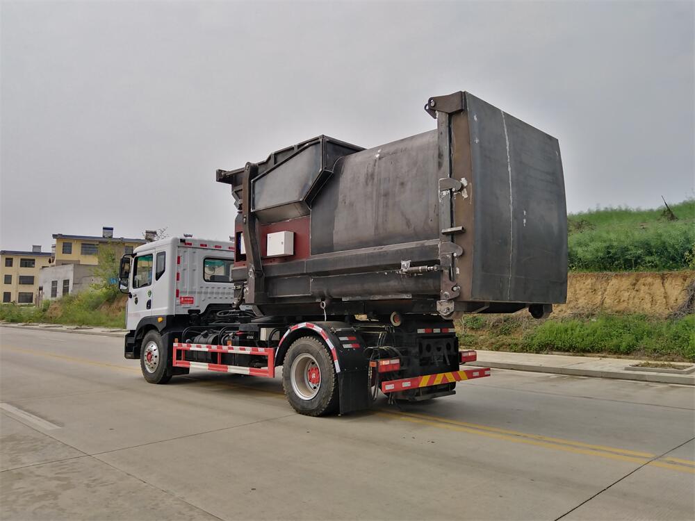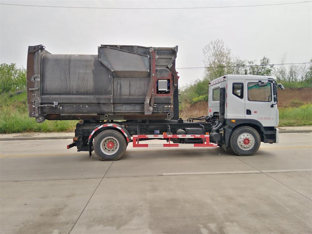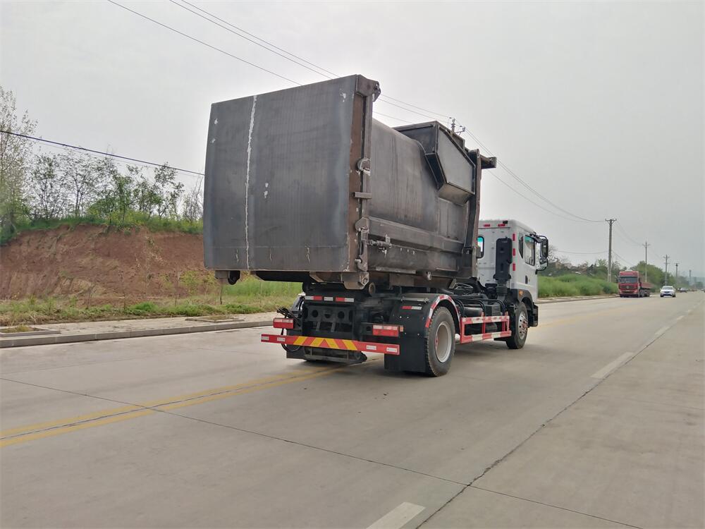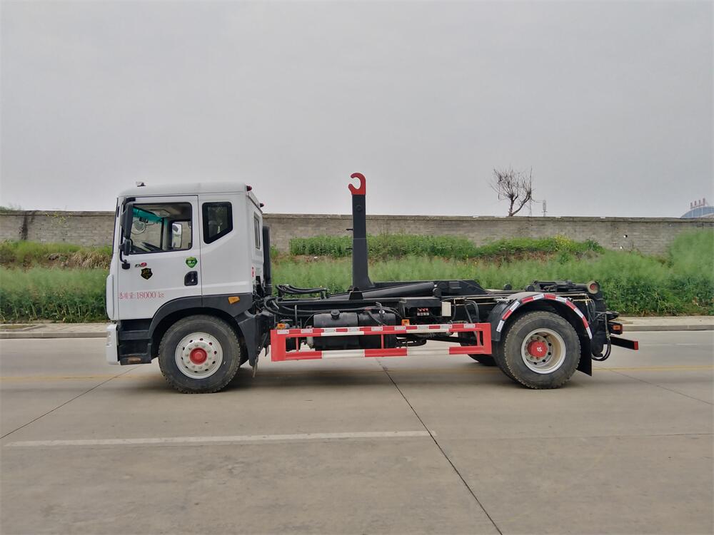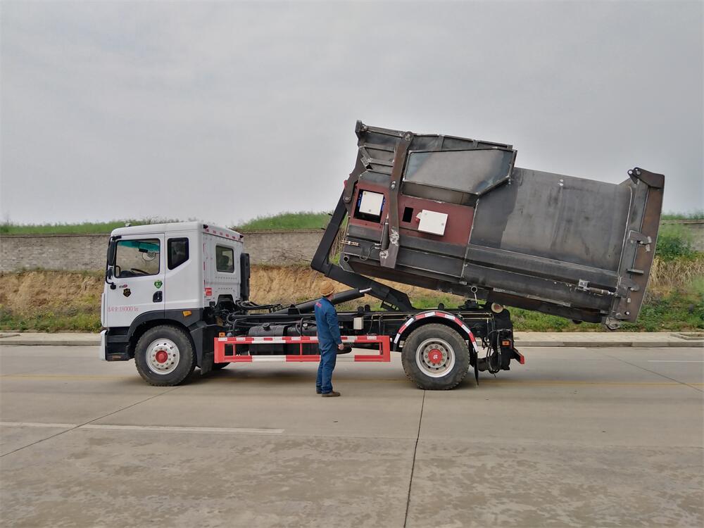 該款鉤臂式垃圾車由液壓系統(tǒng)、操作系統(tǒng)組成。舉升油制缸(1支)系國內知名液壓件廠家生產(chǎn)的雙作用油缸。垃圾廂可自吊上放下,可自行傾倒垃圾,上下一次工作循環(huán)時間≤50S。該車的特點是一個車能配多個垃圾廂,能實現(xiàn)一臺車與多個垃圾廂聯(lián)合作業(yè),循環(huán)運輸,充分提高了車輛的運輸能力。