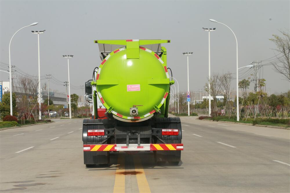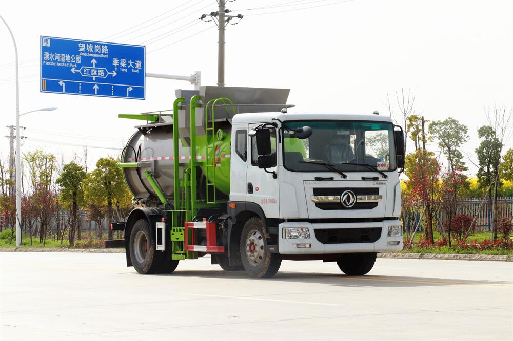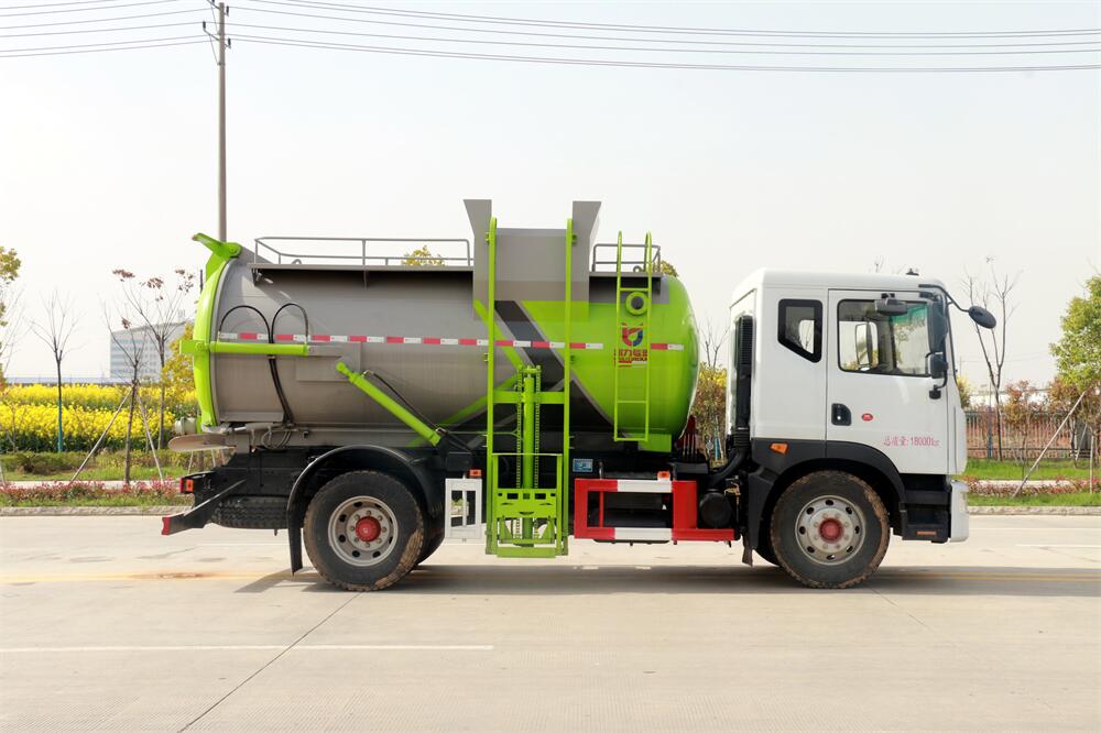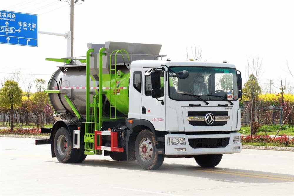 上裝配置:罐體容積10m3,配備120L/240L掛桶提升翻轉機構,液壓系統,后蓋液壓鎖緊開啟,罐體可以舉升自卸,尾部帶自流閥;用于運輸液態垃圾,其特點操作簡單,密封性好,無泄漏,無異味;可選裝固液分離功能,推板擠壓功能,常用于餐館的垃圾轉運處理。