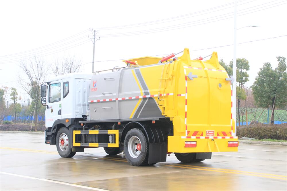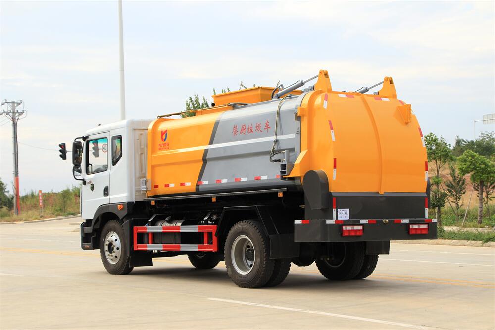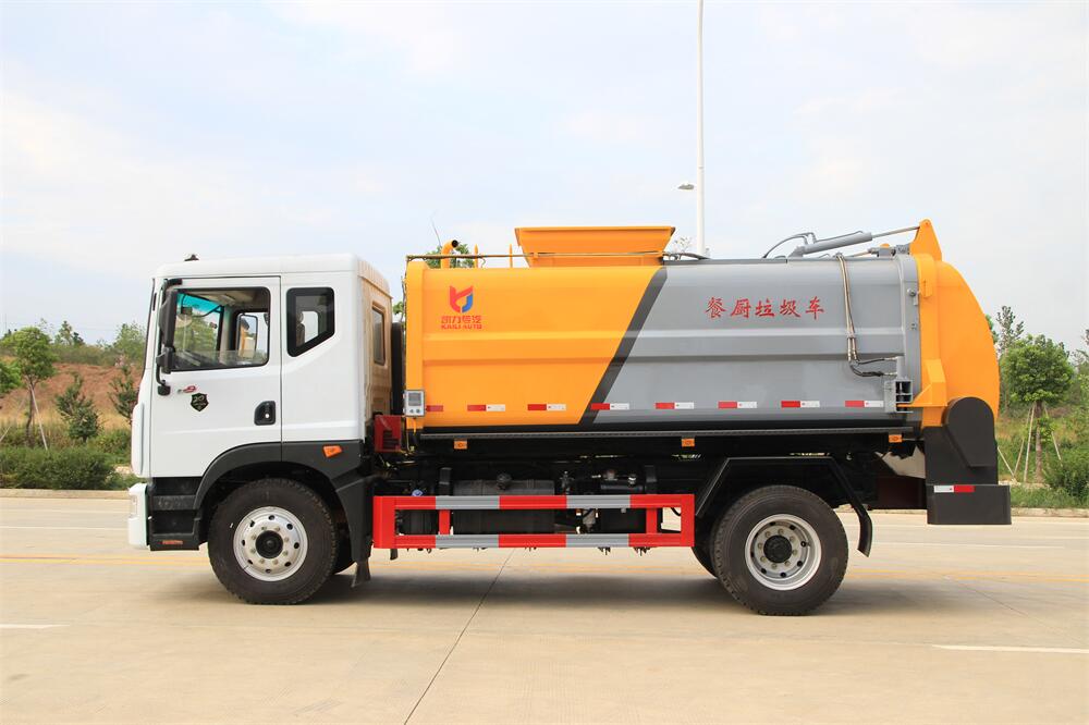 上裝配置:罐體容積10m3,配備120L/240L掛桶提升翻轉機構,液壓系統,后蓋液壓鎖緊開啟,罐體可以舉升自卸,尾部帶自流閥;用于運輸液態垃圾,其特點操作簡單,密封性好,無泄漏,無異味;可選裝固液分離功能,推板擠壓功能,常用于餐館的垃圾轉運處理。