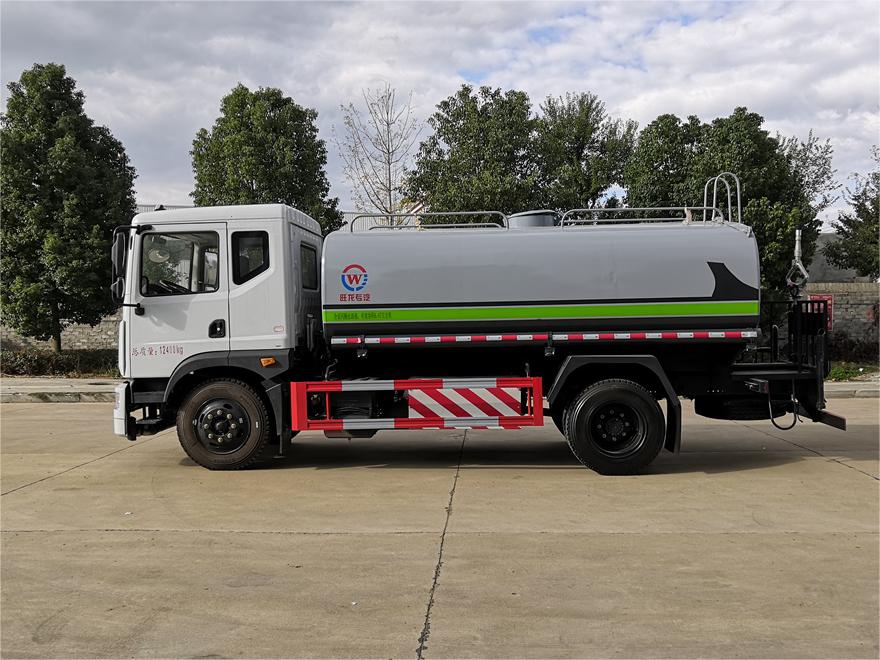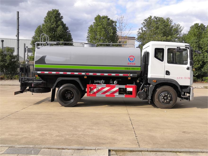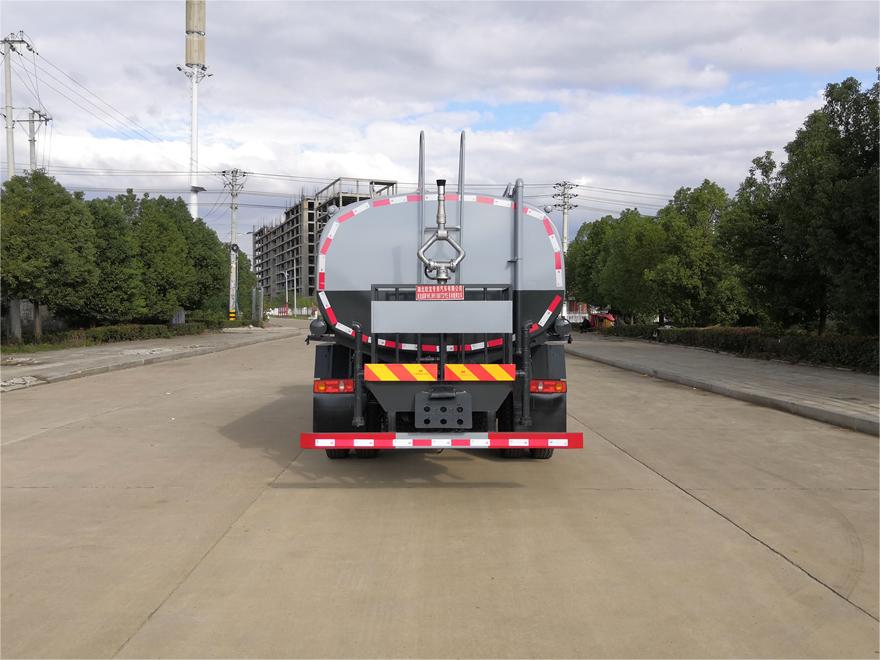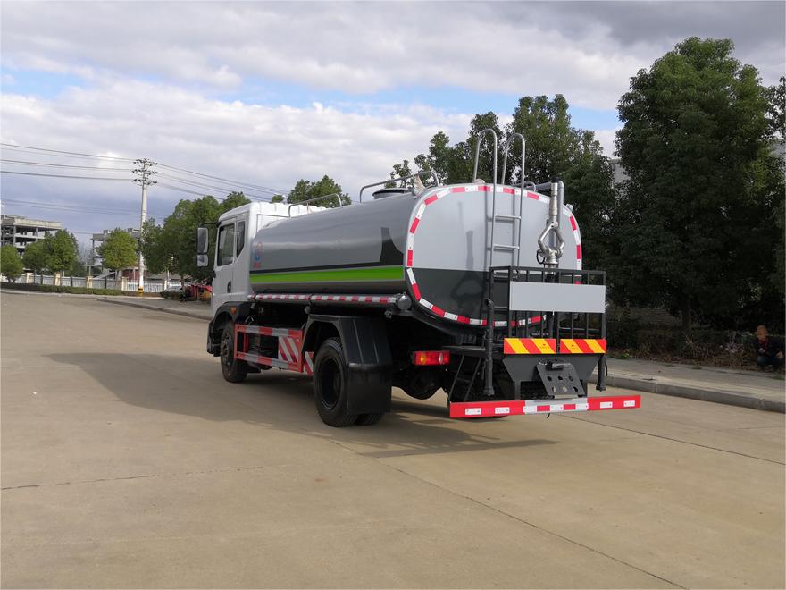 灑水車前裝有鴨形噴嘴或圓頭沖嘴,后面裝有圓柱開(kāi)灑水噴嘴或蓮蓬頭噴嘴,后部有一工作平臺(tái),裝配有水炮。后部還可裝8個(gè)噴嘴(選裝)。