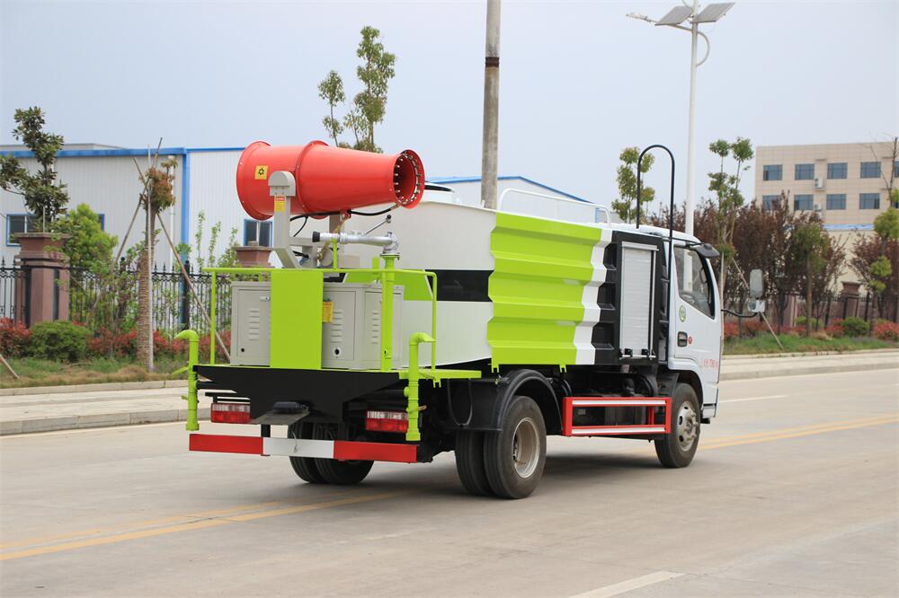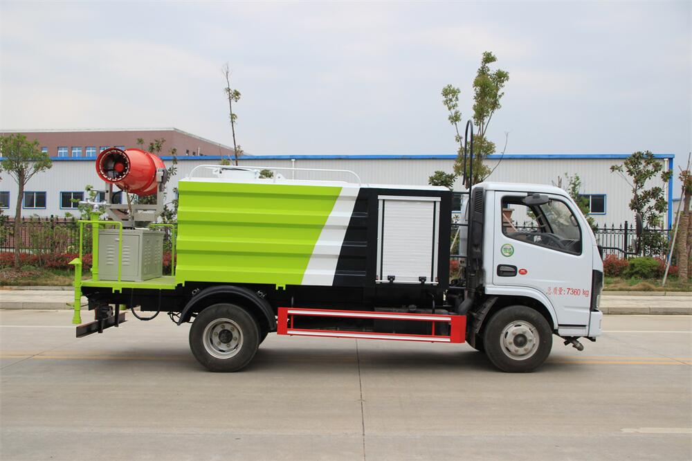 上裝配置:罐體容積為 5-7立方,選配風送式霧炮機組射程30米、40米、50米、60米、80米、100米、120米霧炮,罐體鋼板為4mm碳鋼Q235材質,罐內隔板具有防波作用,以減輕汽車行駛時罐體液體沖擊,罐體及整車外形尺寸按照公告。帶大功率專用灑水泵,泵可自吸自排,整車前沖、后灑、側噴、帶65消防接口,后平臺配CLW-50、CLW-60、CLW-80、CLW-100、CLW-120型風送式霧炮機組;罐體前封頭配大功率柴油發電機組;前封頭帶水位計,后平臺主管路帶1寸澆花接口,后爬梯。帶兩根輸水管及陰陽端。罐體顏色:銀/灰/綠,罐體兩側噴“多功能抑塵車”字樣,貼反光標示。