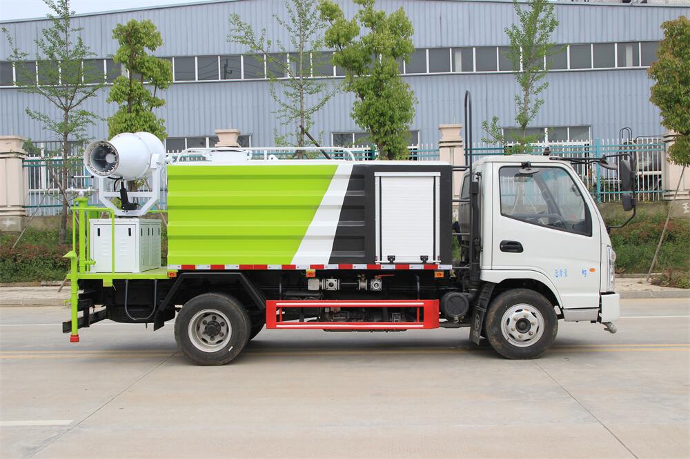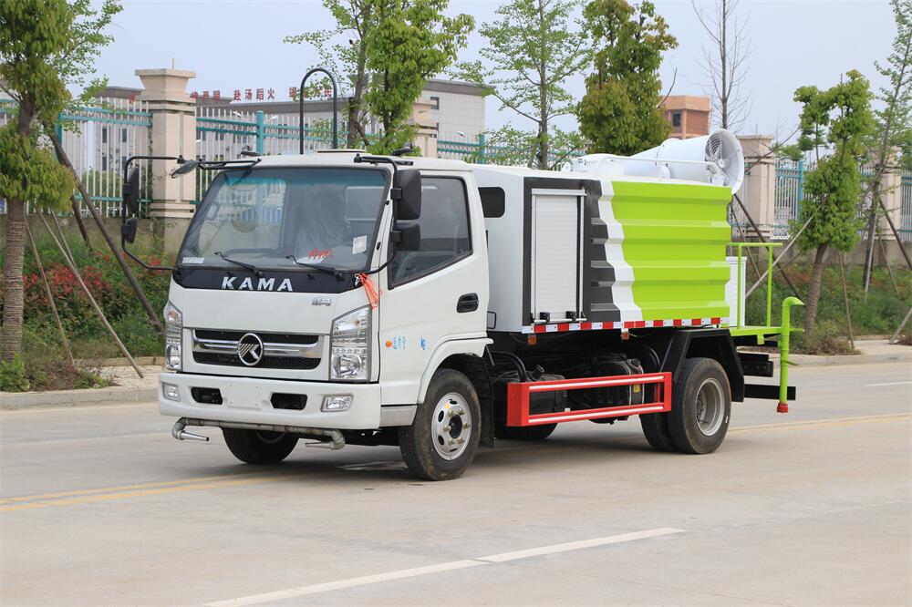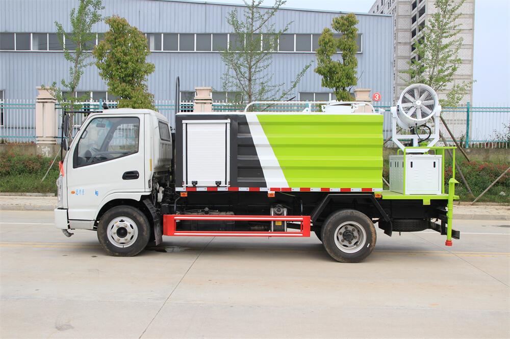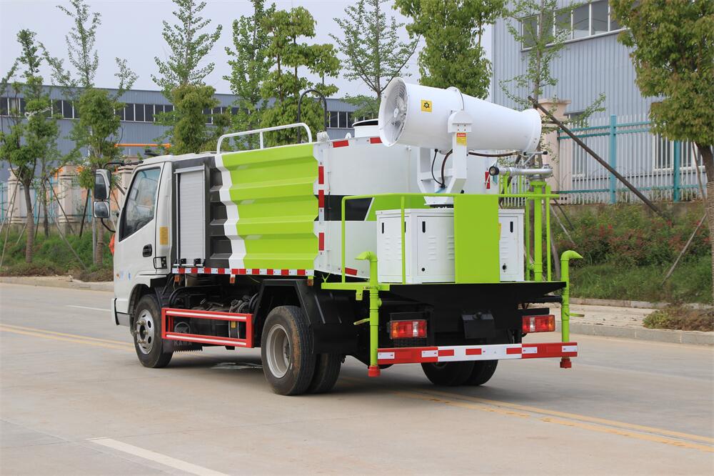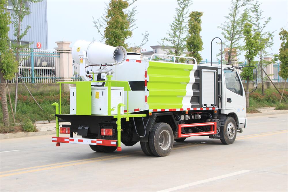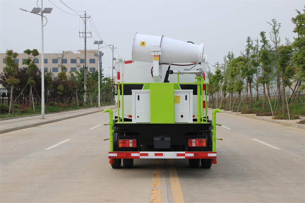 上裝配置:罐體容積為 5立方,選配風送式霧炮機組射程30米、40米、50米、60米、80米、100米、120米霧炮,罐體鋼板為4mm碳鋼Q235材質,罐內隔板具有防波作用,以減輕汽車行駛時罐體液體沖擊,罐體及整車外形尺寸按照公告。帶大功率專用灑水泵,泵可自吸自排,整車前沖、后灑、側噴、帶65消防接口,后平臺配CLW-50、CLW-60、CLW-80、CLW-100、CLW-120型風送式霧炮機組;罐體前封頭配大功率柴油發(fā)電機組;前封頭帶水位計,后平臺主管路帶1寸澆花接口,后爬梯。帶兩根輸水管及陰陽端。罐體顏色:銀/灰/綠,罐體兩側噴“多功能抑塵車”字樣,貼反光標示。