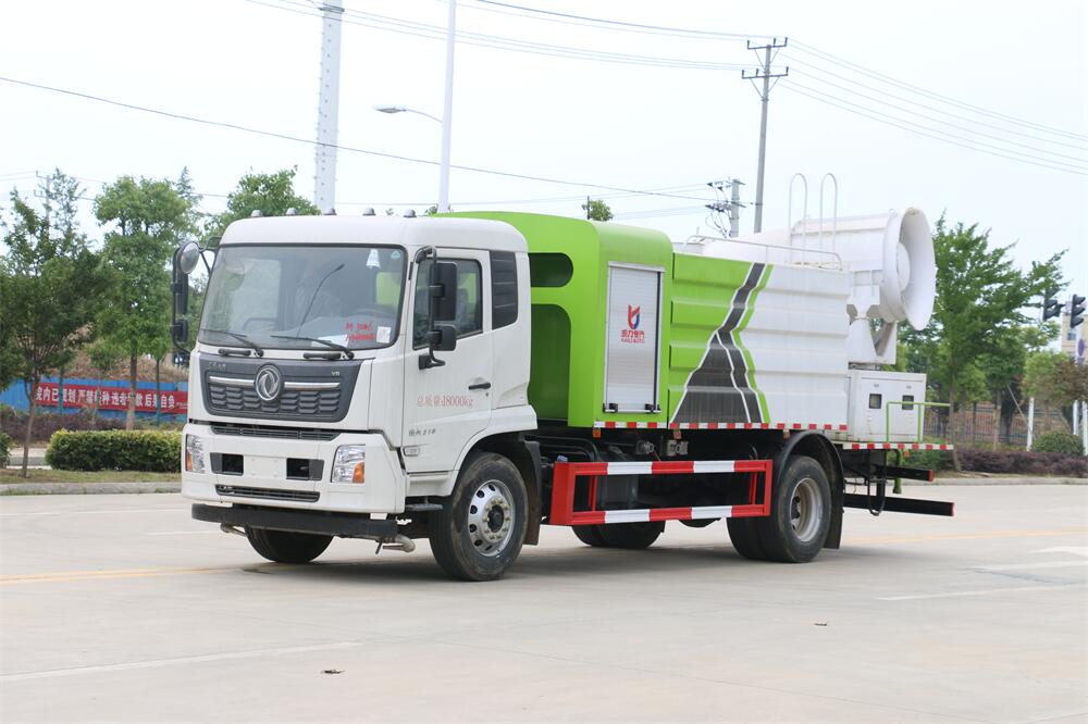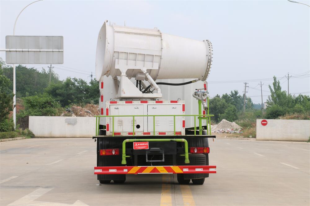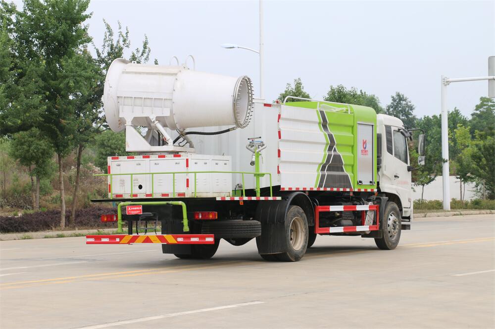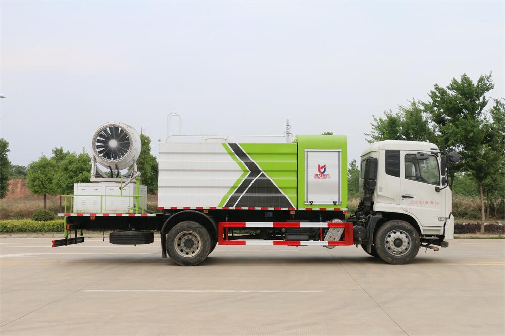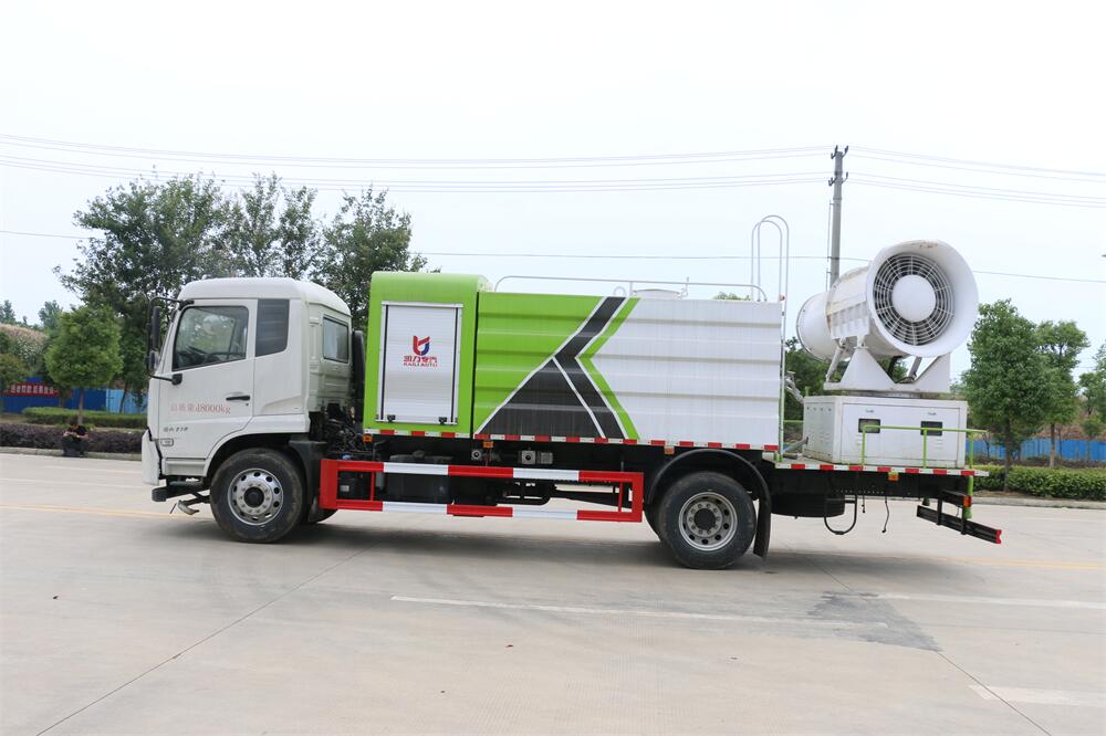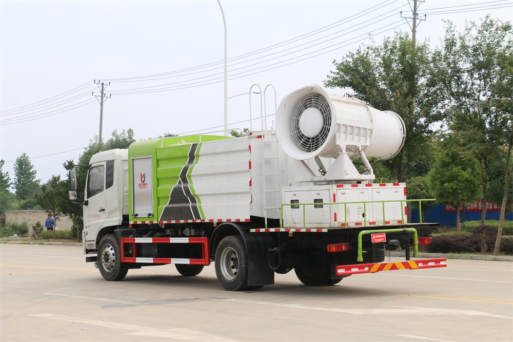 上裝配置:罐體容積為 12立方,選配風送式霧炮機組射程30米、40米、50米、60米、80米、100米、120米霧炮,罐體鋼板為4mm碳鋼Q235材質(zhì),罐內(nèi)隔板具有防波作用,以減輕汽車行駛時罐體液體沖擊,罐體及整車外形尺寸按照公告。帶大功率專用灑水泵,泵可自吸自排,整車前沖、后灑、側(cè)噴、帶65消防接口,后平臺配CLW-50、CLW-60、CLW-80、CLW-100、CLW-120型風送式霧炮機組;罐體前封頭配大功率柴油發(fā)電機組;前封頭帶水位計,后平臺主管路帶1寸澆花接口,后爬梯。帶兩根輸水管及陰陽端。罐體顏色:銀/灰/綠,罐體兩側(cè)噴“多功能抑塵車”字樣,貼反光標示。