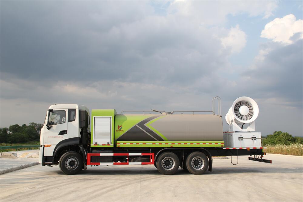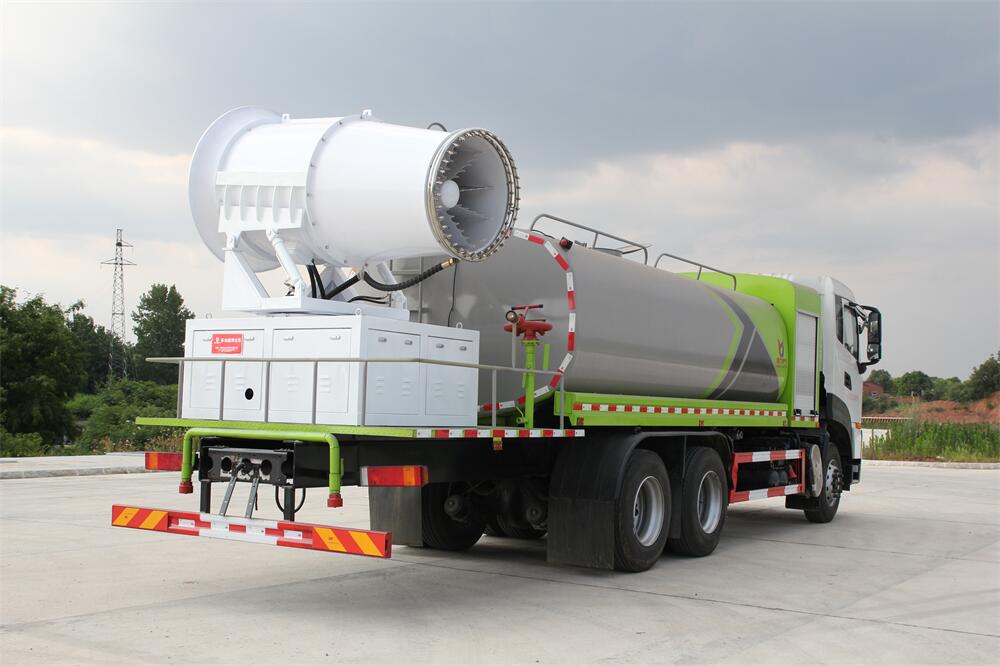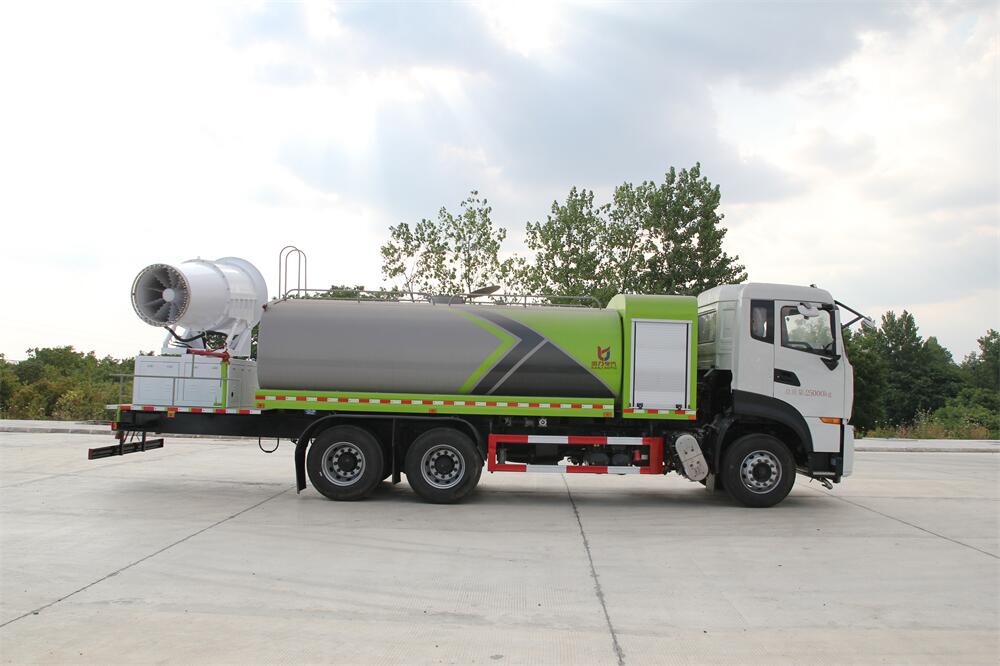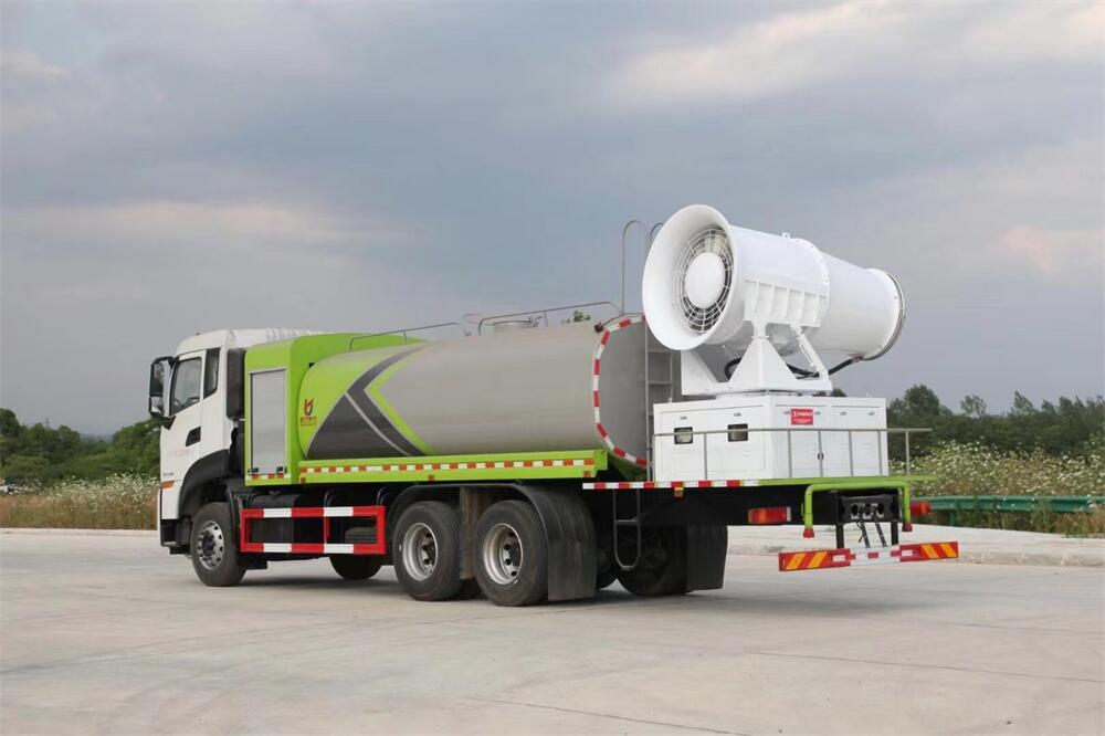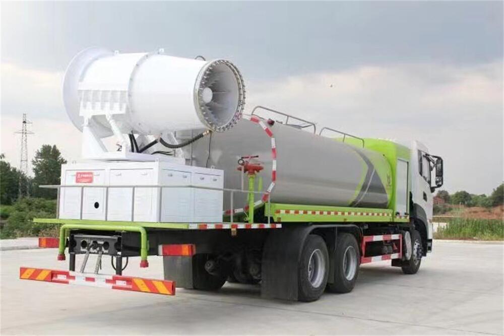 上裝配置:罐體容積為 16立方,選配風送式霧炮機組射程30米、40米、50米、60米、80米、100米、120米霧炮,罐體鋼板為4mm碳鋼Q235材質,罐內隔板具有防波作用,以減輕汽車行駛時罐體液體沖擊,罐體及整車外形尺寸按照公告。帶大功率專用灑水泵,泵可自吸自排,整車前沖、后灑、側噴、帶65消防接口,后平臺配CLW-50、CLW-60、CLW-80、CLW-100、CLW-120型風送式霧炮機組;罐體前封頭配大功率柴油發電機組;前封頭帶水位計,后平臺主管路帶1寸澆花接口,后爬梯。帶兩根輸水管及陰陽端。罐體顏色:銀/灰/綠,罐體兩側噴“多功能抑塵車”字樣,貼反光標示。