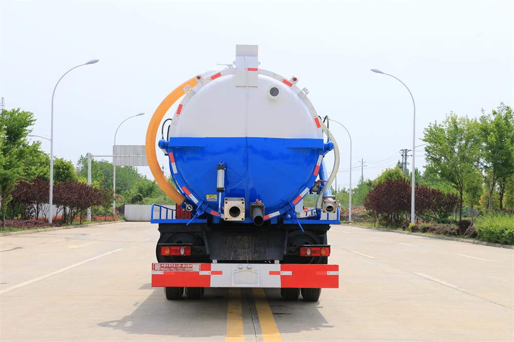 上裝配置:清水罐約 5 立方,污水罐約 10 立 方;罐體 8mm 厚,封頭 8mm 厚,水罐、污罐可 互通,用 100 球閥**開(kāi)關(guān);清洗部份采用天 津通潔高壓泵,壓力 19Mpa,流量 215L/min, 配 80 米直徑 22 高壓管帶液壓卷盤(pán);吸污部份 采用濰柴375馬力副發(fā)動(dòng)機(jī)帶山東SK-30水循 環(huán)泵(副發(fā)自帶),吸污罐帶舉升,后封頭焊 死(可選擇后封頭全開(kāi)),尾部加裝一個(gè) 600mm 快開(kāi),罐體后尾部一個(gè) DN150 排污口球閥,一 個(gè) DN100 吸污球閥帶出口盤(pán),一個(gè)視污窗,一 根 10m 吸污管,一套陰陽(yáng)端,壓力表,防溢 閥,箭頭燈,工具箱,淋管裝置,高壓泵帶氣 吹水。配一個(gè) 4.5 公斤水雷噴頭,另帶一個(gè) 80 公分手持洗車(chē)噴頭。