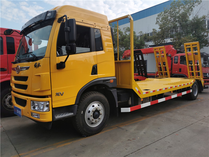 解放凹板單橋平板運輸車 解放駕駛室 排放:國五新規 發動機:錫柴4缸180馬力 變速箱:伊頓6檔變速箱 前后橋:145加強后橋 軸距:6.45米 輪胎:825-20鋼絲胎 大梁: 250雙大梁 整車對應尺寸:7800*2550*2970 車型亮點:ABS防抱死系統 . 剎車間隙自動調整臂、防飛濺、前下防護,北斗,GPRS行車記錄儀,國產ABS,電動門窗,空氣彈簧座椅,空調。可拉15噸以下挖機等設備。此產品**大的優勢是離地低,離地僅90公分,更容易通過。 上裝采用五毫米花紋鋼板,整體凹梁設計,加強雙簧爬梯,可拉15噸以下挖機。 可選裝配置:液壓全自動爬梯,折疊型加長型液壓全自動爬梯,可加裝兩邊伸展,一邊可伸縮30公分。